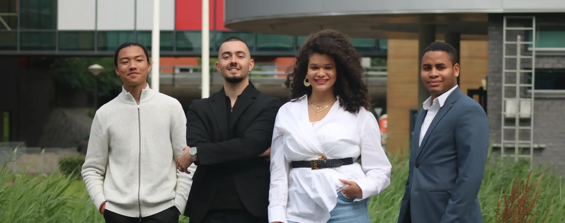 De CSR bestaat uit een Dagelijks Bestuur (DB) en vertegenwoordigers van de studentenraden van alle mbo-colleges. Op de foto zie je de leden van het DB: van links naar rechts: Alano Leider (Algemeen Bestuurslid), Osman Halici (Vice-voorzitter), Kayleigh el Chab (Voorzitter) en Jose Valencia (Penningmeester).