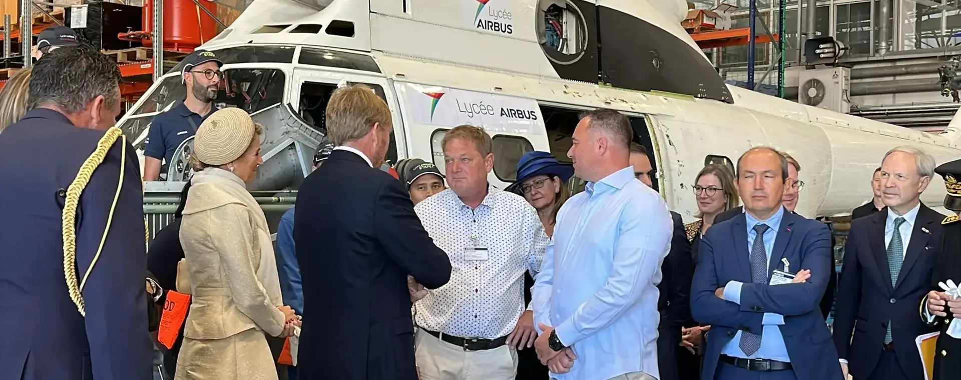 Tijdens de missie vond een uitwisseling plaats waarbij onze docenten René de Moor en Jeroen van Gerven samen met opleidingsmanagers Yara van Oosterhout en Eric Sliphorst kennis mochten maken met Lycée Airbus, een beroepsschool in Toulouse gespecialiseerd in luchtvaart. Tijdens gezamenlijke sessies werden lessen bezocht, didactische aanpakken vergeleken en nieuwe ideeën opgedaan. Er is afgesproken dat collega’s van Lycée Airbus ook op bezoek komen bij MBO College Airport en dat we in de toekomst ook uitwisseling voor onze studenten mogelijk willen gaan maken. Een bijzonder moment tijdens de uitwisseling was het bezoek van het koninklijk paar aan Lycée Airbus. René en Jeroen kregen de kans om hun ervaringen te delen.