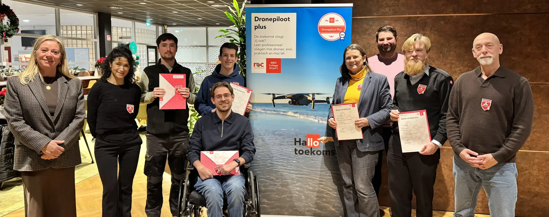 Op MBO College Airport, onderdeel van het ROC van Amsterdam - Flevoland, is gisteren op feestelijke manier het afronden van de eerste microcredential, Dronepiloot Plus, gevierd. Tijdens de uitreiking in Hoofddorp ontvingen de deelnemers de officiële edubadge, een digitaal certificaat dat laat zien welke actuele dronevaardigheden zij beheersen. Met deze mijlpaal zet het ROC van Amsterdam - Flevoland een belangrijke stap in de ontwikkeling van modulair en flexibel beroepsonderwijs.